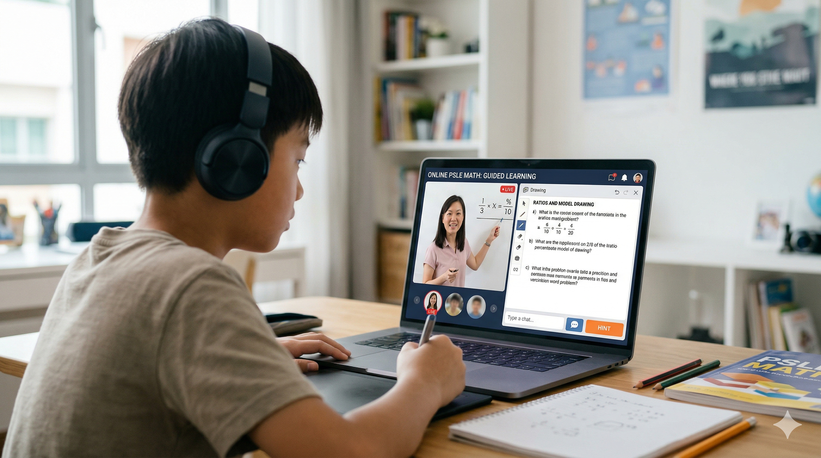 Built from recurring question structures in past PSLE Math papers. Your child attempts the questions first — independently, just like the real exam.