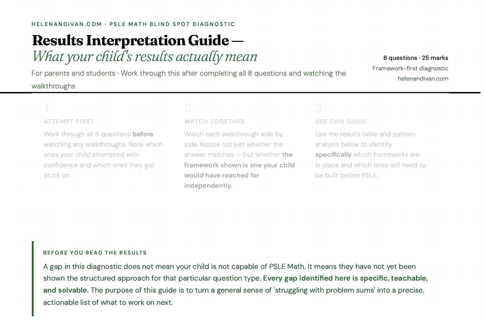 This is a diagnostic test, not a lesson. Your child works through 8 questions — 25 marks, 30 minutes — drawn from recurring question structures across the last 10 years of PSLE Math papers. No instruction before. No hints during. Just the questions, exactly as they would appear in the exam. When they submit, the walkthroughs unlock. Each of the 8 videos shows the framework behind that question type: why students who don't know it get stuck, and why students who do know it solve it in under 3 minutes. What comes with it: → 8 video walkthroughs — framework first, not just the answer → The Framework Reference Card — all 8 approaches on one page for revision → The Results Interpretation Guide — which AL band your child is currently on track for, and where to focus next